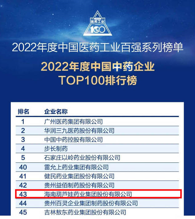 会议期间,一年一度的中国医药工业百强系列榜单隆重揭晓,云顶国际药业集团凭借领先的研发优势和扎实的生产实力以及稳健的市场推广能力,连续第四年成功入选“2022年度中国中药企业TOP100排行榜” ,排名稳步上升至第43位。
